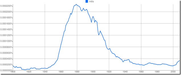 Then I discovered that Ngram Viewer is case sensitive but Google Books Search is not. So I was curious to find out how will the graph pan out for India with a capital ‘I’.